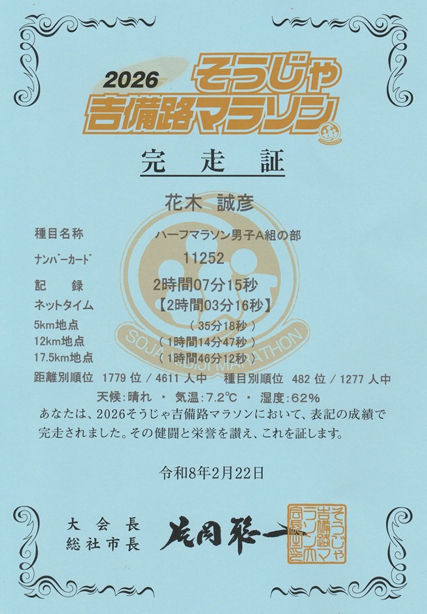 2月にして季節の変わり目を思わせる気候。スタートからの大渋滞は、無理に前に出ず、スローペースに身を任せた。余裕があったので、備中国分寺をゆっくり眺められた。アップダウンは緩やかで、気持ちを切り替えるにはちょうどいい。地域に根差した人気大会だけに、伯備線はなかなか骨が折れた。