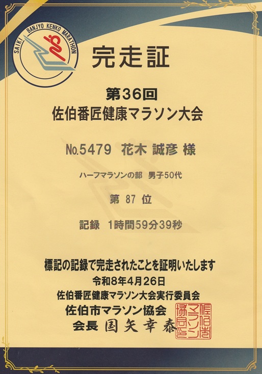 冷たい雨が降り注ぐ中、霧に煙る山間をずぶ濡れで黙々と走る。一番きつい18キロの上り坂を必死に堪えて、ラスト1キロはダッシュ。何とか2時間を切れた。練習不足は反省する必要があるが、最後まで垂れずに走り切れたのは満足。ゴール後の椎茸とあおさの浦部汁は、冷えた身体に最高のご褒美だった。